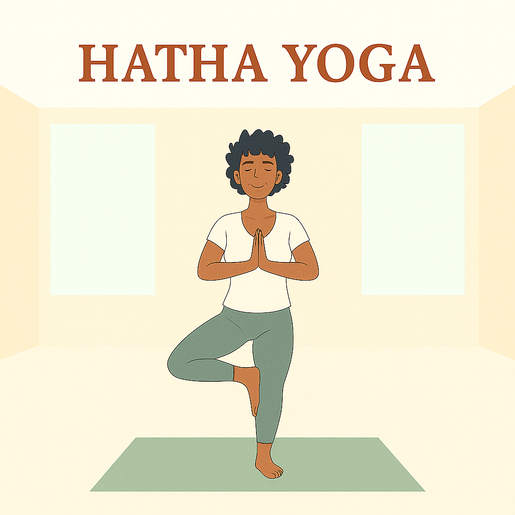 Hatha Yoga builds balance and strength through active postures and breath control.